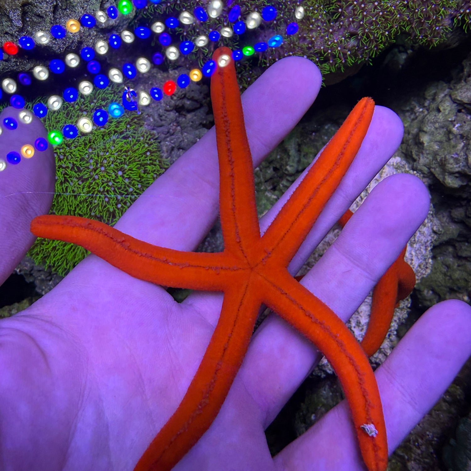 The Red Linckia Starfish (Linckia sp., often sold as Linckia multifora or “mottled red linckia”) is a striking, reef-safe echinoderm prized for its vivid red to rust coloration and elegant, tapered arms. Best kept in a mature, established reef (75+ gallons) with abundant live rock, this species grazes on natural biofilm, microalgae, and sponges rather than typical meaty foods.