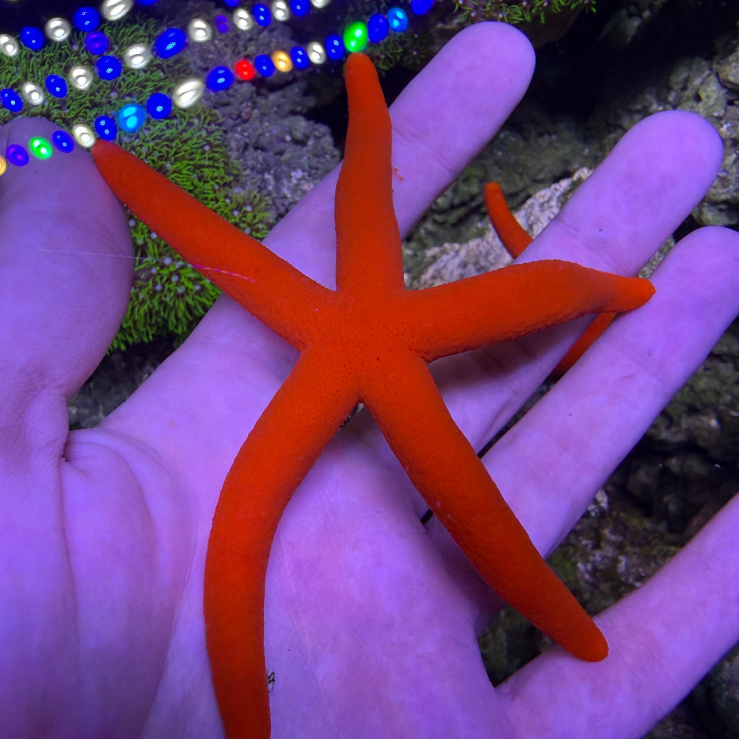 Peaceful and reef safe with corals and fish, Red Linckia can be threatened by harlequin shrimp and aggressive hermits. Provide shaded crevices, gentle-to-moderate flow, and pristine water to prevent arm necrosis and bacterial infections. While they primarily self-feed from rock surfaces, occasional target feeding with finely minced clam, mysis, or reef roe can help in sparse systems.