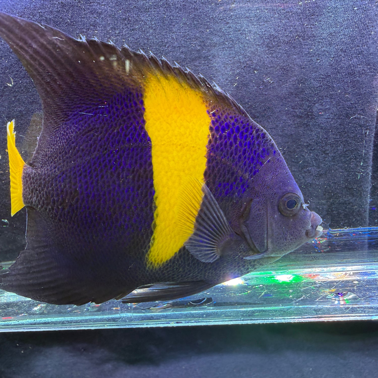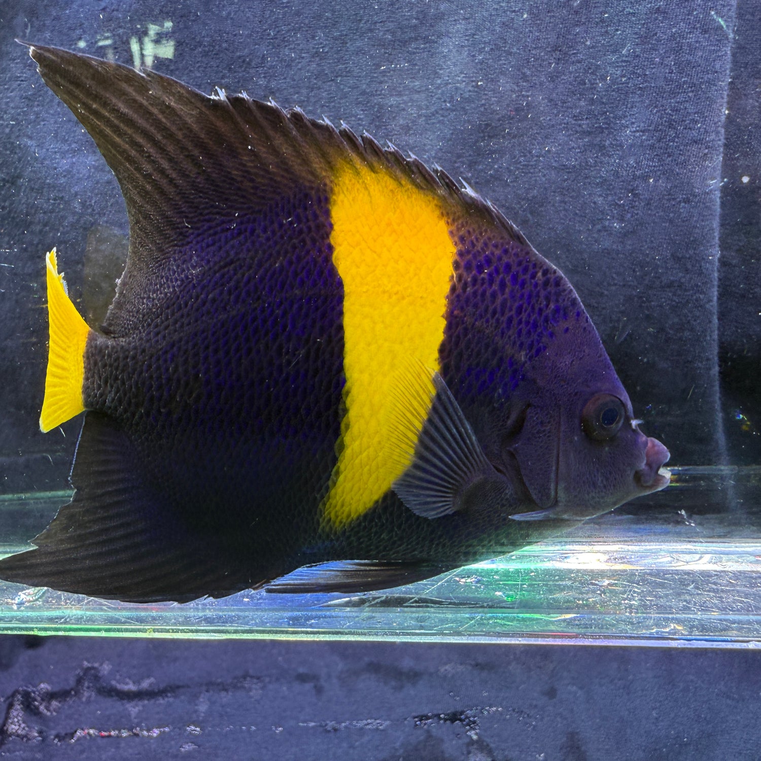 The Asfur Angelfish (Pomacanthus asfur), also known as the Arabian Angelfish or Crescent Angelfish, is a spectacular marine species native to the Red Sea and the western Indian Ocean. This large, majestic angelfish is easily recognized by its deep blue body, bright yellow crescent band, and yellow tail—making it one of the most visually stunning saltwater fish available for home aquariums. In the wild, Asfur Angelfish inhabit coral reefs and rocky lagoons, where they feed on sponges, tunicates, and algae. Their regal coloration and graceful swimming patterns make them a prized centerpiece for advanced marine aquarists seeking a truly exotic show fish.