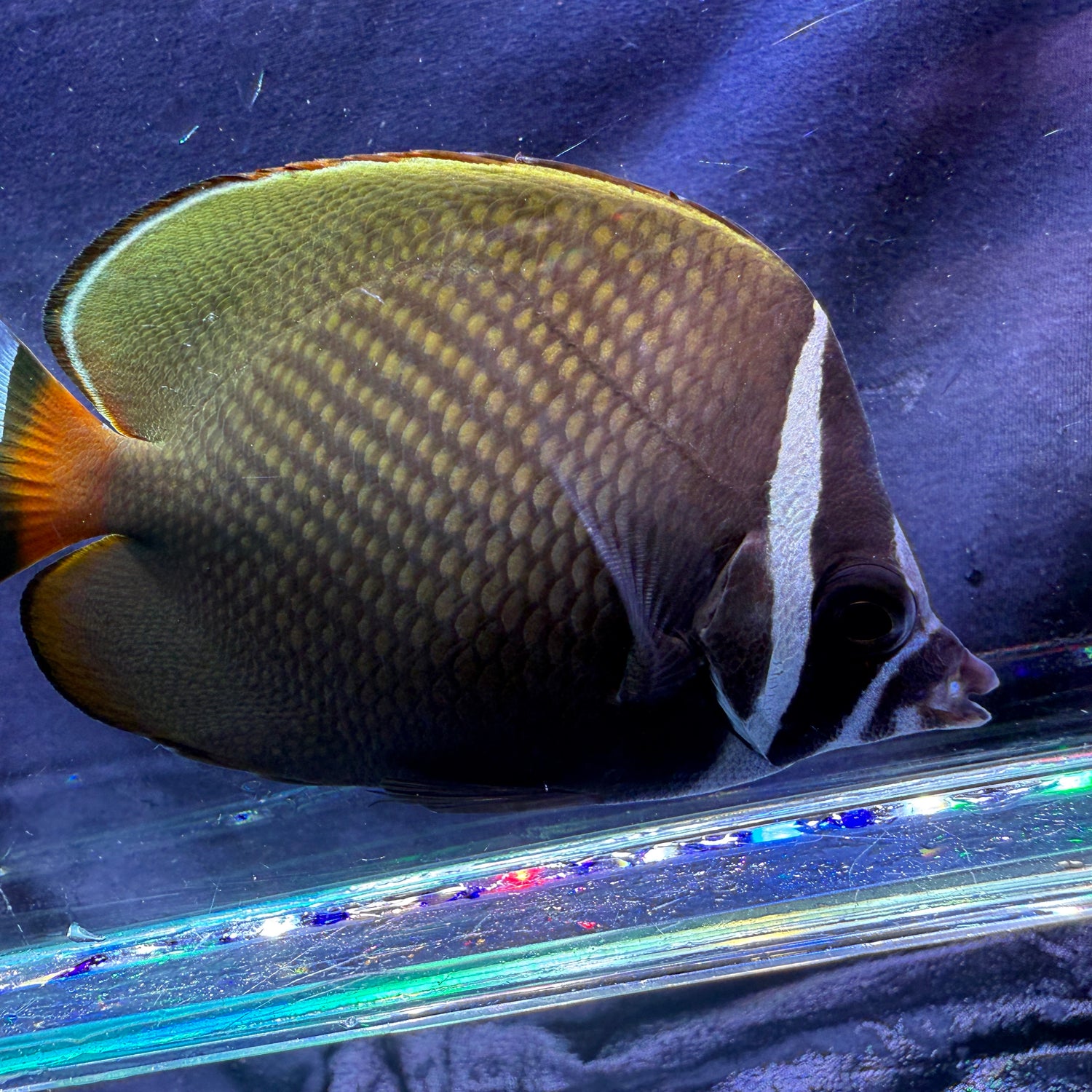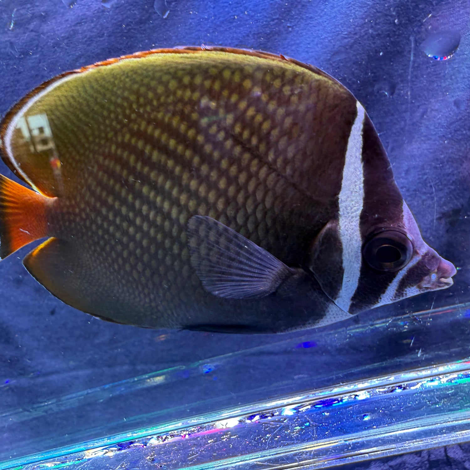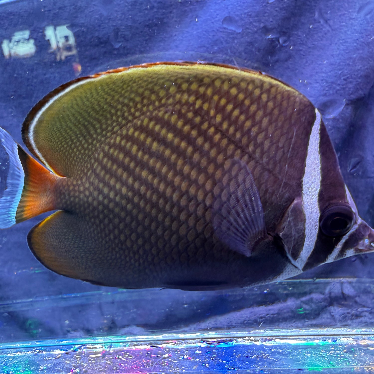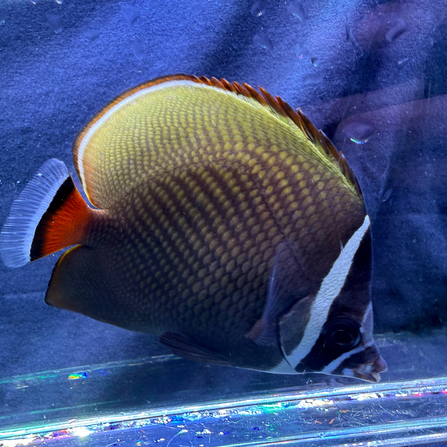 The Pakistan Butterflyfish (Chaetodon collare), also known as the Redtail Butterflyfish or Collare Butterflyfish, is an elegant and hardy marine species native to the Indian Ocean, ranging from the Maldives to Indonesia and the Arabian Sea near Pakistan. This butterflyfish is admired for its distinctive appearance—an intricate pattern of fine scales giving a net-like effect across the body, a rich brown coloration, and a bright red tail fin that provides a stunning contrast. Peaceful by nature, the Pakistan Butterflyfish is often seen in pairs around coral reefs, feeding on small invertebrates and coral polyps. Its beauty, resilience, and adaptability make it a popular choice for both display aquariums and reef enthusiasts.