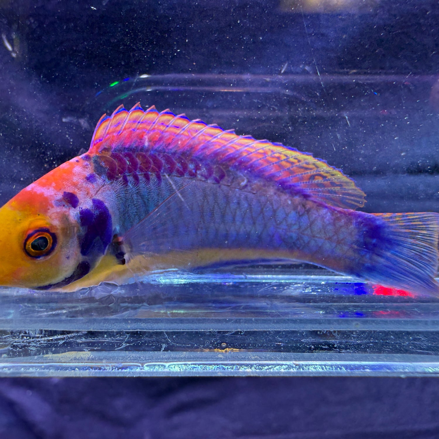 Commonly called the Red-Head Solon (Tricolor) Fairy Wrasse, Cirrhilabrus solorensis is a stunning, reef-safe showpiece with electric blues, teals, and a vivid orange-red crown—colors that intensify with good diet and stable water. Peaceful and active, this fairy wrasse makes a superb community reef inhabitant that won’t nip corals or clams. Provide a tight-fitting lid (expert jumpers!), ample rockwork to explore, and moderate flow. Unlike burying wrasses, C. solorensis sleeps in the rockwork, so no deep sand bed is required. Feed small, meaty foods (mysis, copepods, enriched brine, finely chopped seafood) 2–3x daily for best coloration and vigor. Avoid aggressive tankmates and outsized predators. Our expert-raised specimens are conditioned, eating well, and shipped UPS Next Day Air® from Discover Aquatics in Taylor Mill, KY—serving Cincinnati, Northern Kentucky, and Indiana. Buy Cirrhilabrus solorensis online with confidence: a hardy, beginner-friendly fairy wrasse that brings constant motion and color to mixed reefs. Select individuals may be offered WYSIWYG when available. Explore our saltwater fish for sale and add this reef-safe fish to your aquarium today.