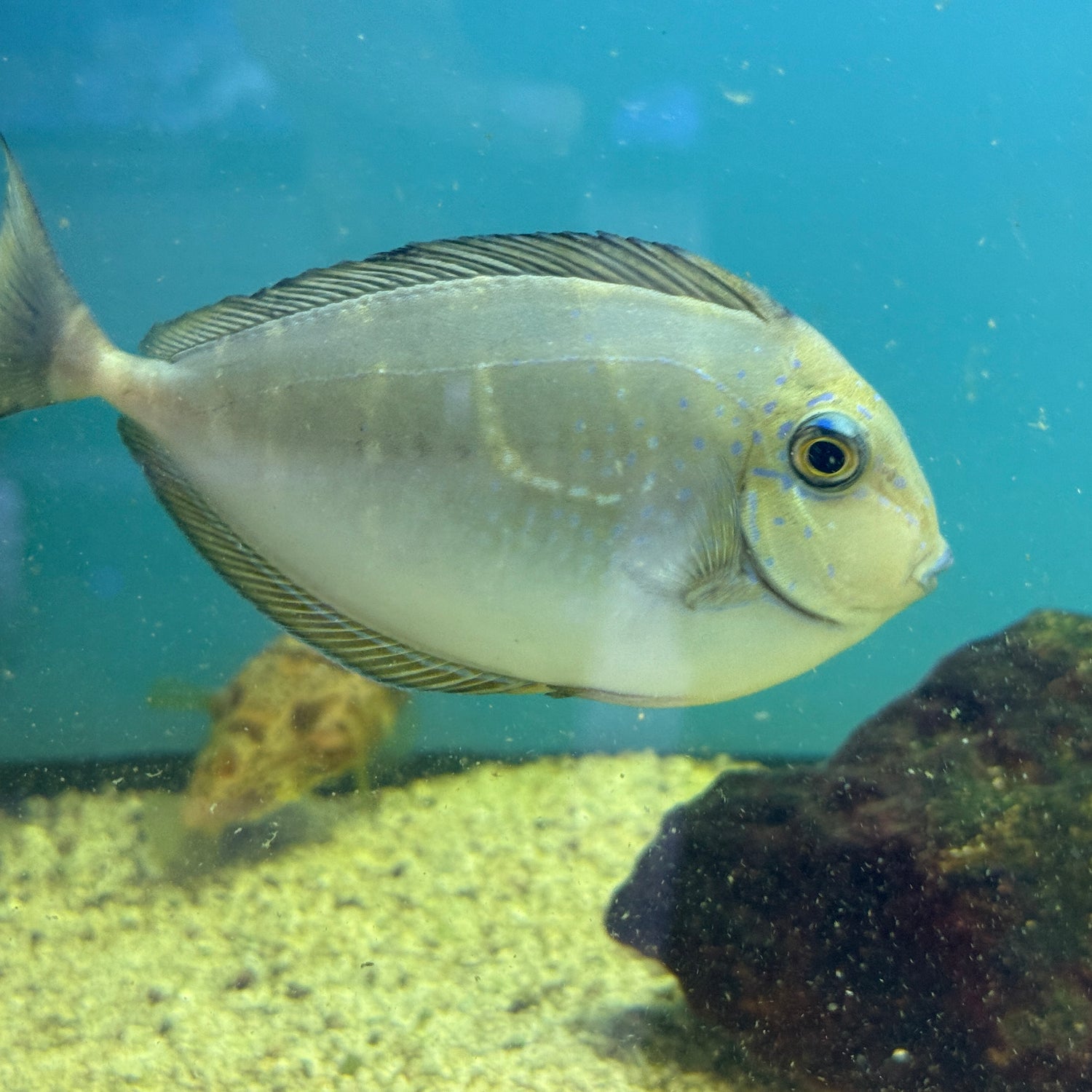Naso vlamingii—better known as the Vlamingi Tang—is a commanding, generally reef-safe grazer that brings nonstop motion and personality to very large marine systems. Juveniles show soft gray-brown tones with faint spots; adults develop electric blue speckling, golden accents, and elegant fin streamers, flashing dramatic colors during displays. This active swimmer needs broad, open lanes, strong oxygenation, and abundant mature live rock to browse; plan for a truly spacious aquarium (240–300+ gallons). Typically peaceful, it may posture toward other tangs—especially similarly shaped species—so keep singly or add last. Feed a varied, algae-focused diet (nori/seaweed clips, spirulina pellets, quality herbivore blends) with occasional mysis to maintain color and condition. While considered a reef safe fish, like many large Naso it may sample fleshy LPS if underfed; frequent feedings help keep it focused on film algae and diatoms. Our Vlamingi Tangs for sale are expertly conditioned at Discover Aquatics in Taylor Mill, KY and ship via UPS Next Day Air® for peak vitality. Buy saltwater fish online with confidence from your local aquarium store serving Cincinnati, Northern Kentucky, and Indiana—and complete your display with our WYSIWYG coral.